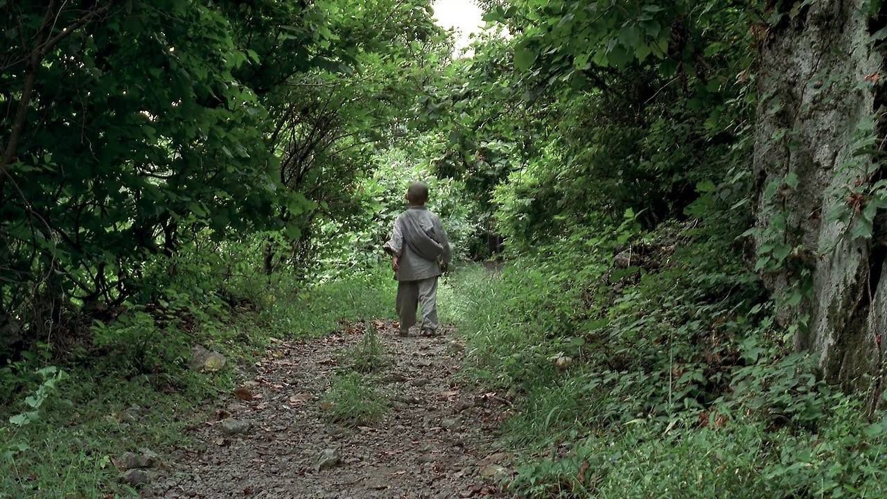 Ông giờ đây đã trở thành sư phụ nuôi dạy đứa bé ngày xưa, giống ông ngày nhỏ như đúc, gây hiểu lầm cho khán giả rằng đây chính là đứa con trai của ông và người phụ nữ kia chính là người vợ ngày xưa ông đã tàn nhẫn giết hại. Nhưng không, vợ ông đã chết từ lâu và chú tiểu nhỏ này chỉ hiện hữu cho tất cả mọi chúng sanh, sống-trải-giác ngộ. Tội ác giờ đây đã được nâng lên gấp đôi khi chú tiểu nhét đá vào miệng của các loài vật và cười thật to khi thấy chúng vật lộn giữa ranh giới sống chết, để rồi gây nghiệp, mở ra luân hồi. Chú khổ.